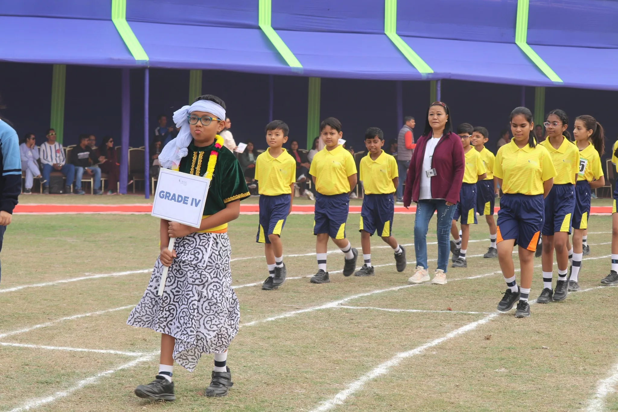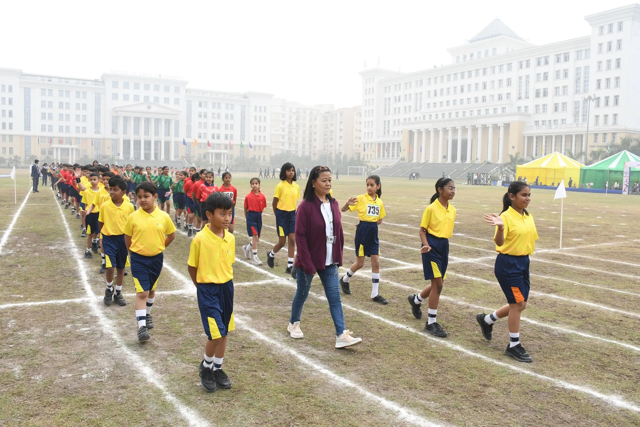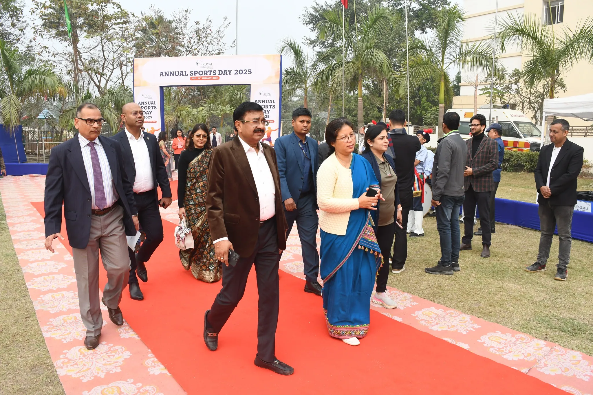 Day 2 of Annual Sports Day ( Grades II to V ) was celebrated in Royal Global School on 31st January 2025 at the Royal Garden, celebrating the spirit of participation and effort. The event began with a vibrant march-in of students, led by placard holders dressed in traditional North-East attire, followed by the flag hoisting by the Chief Guest, Ms. Nandita Garlosa, Minister of Sports and Youth Welfare, Assam. Dr. Debanga Sarma and Dr. Vaishali Sarma, esteemed parents, were the guests of honor. The sports event featured an energetic atmosphere, with students representing the four houses—Gandhi, Mother Teresa, Tagore, and Vivekananda—ready for the competitions.