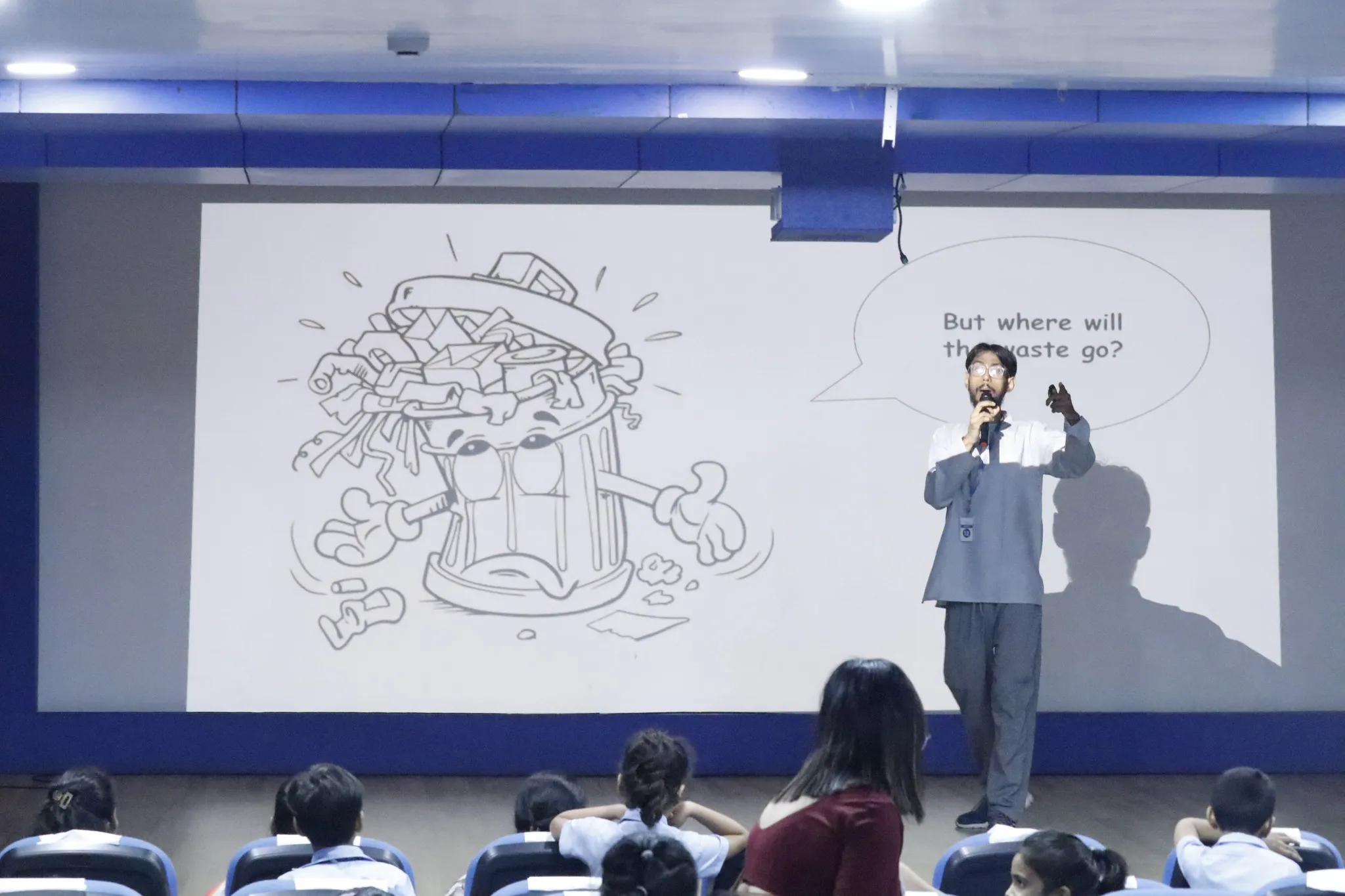 As part of Climate Week 2024, a session on water conservation and waste management was conducted by Ms. Brinda Beriya and Mr. Siddharth Rasaily, prominent activists from ‘Young Indian’ and ‘The Midway Journey.’ The event featured an insightful presentation that aimed to raise awareness and inspire students to take action.