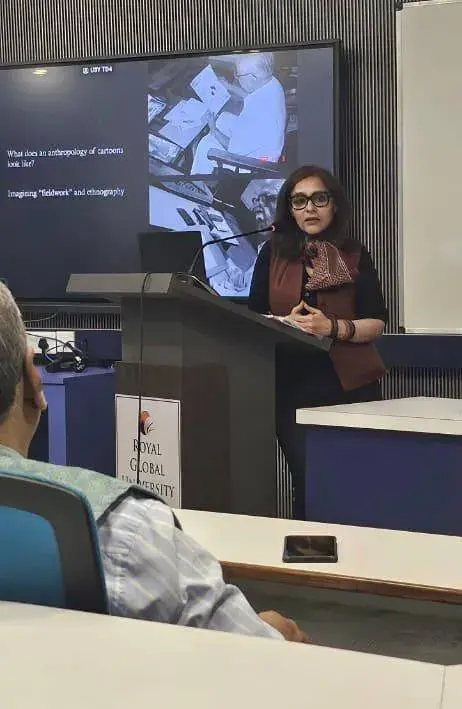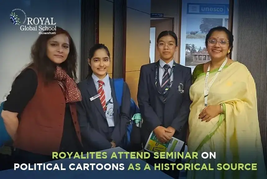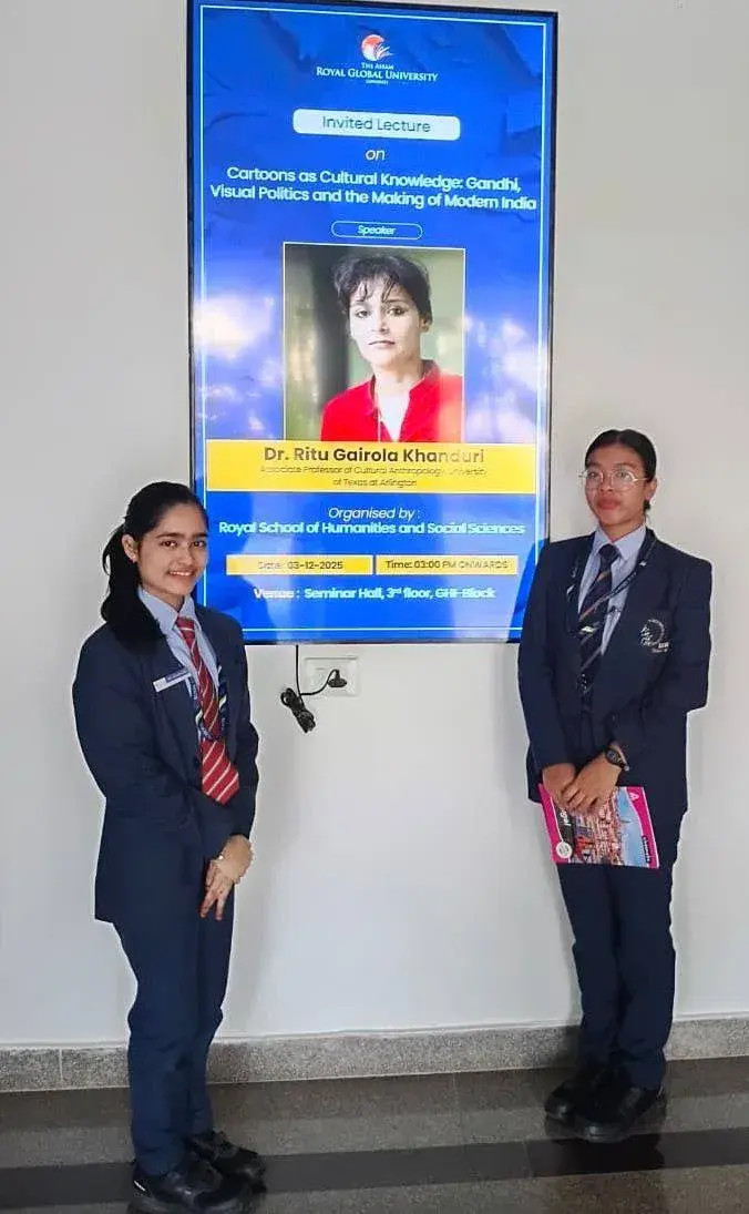 On 3rd December, 2025, two students of Grade 11 Humanities, Bhargavi Devi and Grace Kharbuli, along with the Club In-Charge, Ms Pooja Bhattacharjee proudly represented the Sanskriti – History and Heritage Club at a lecture hosted by RSHSS, The Assam Royal Global University, . The session, delivered by Dr. Ritu Gairola Khanduri, Associate Professor of Cultural Anthropology (University of Texas at Arlington), focused on “Cartoons as Cultural Knowledge: Gandhi, Visual Politics and the Making of Modern India.”