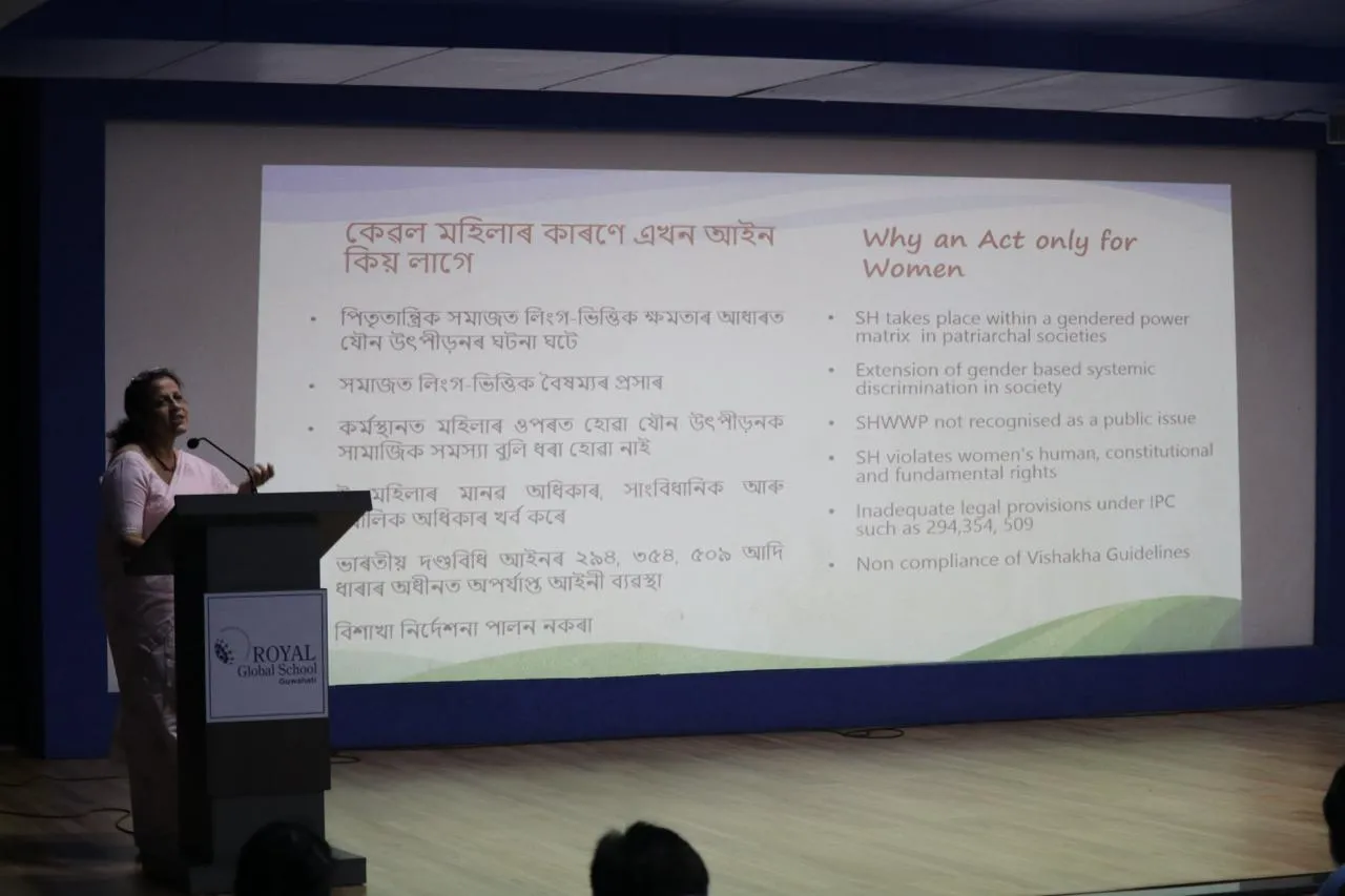 A session on raising awareness about the Prevention of Sexual Harassment (POSH) at the workplace was conducted for the faculty and administrative staff of Royal Global School by Ms. Anurita P. Hazarika, Executive Director (in-charge) of North East Network (NEN).