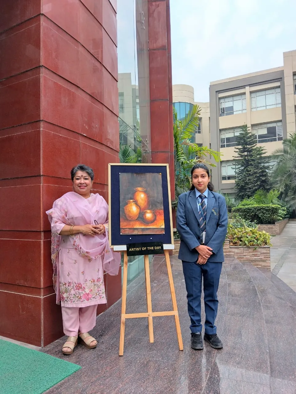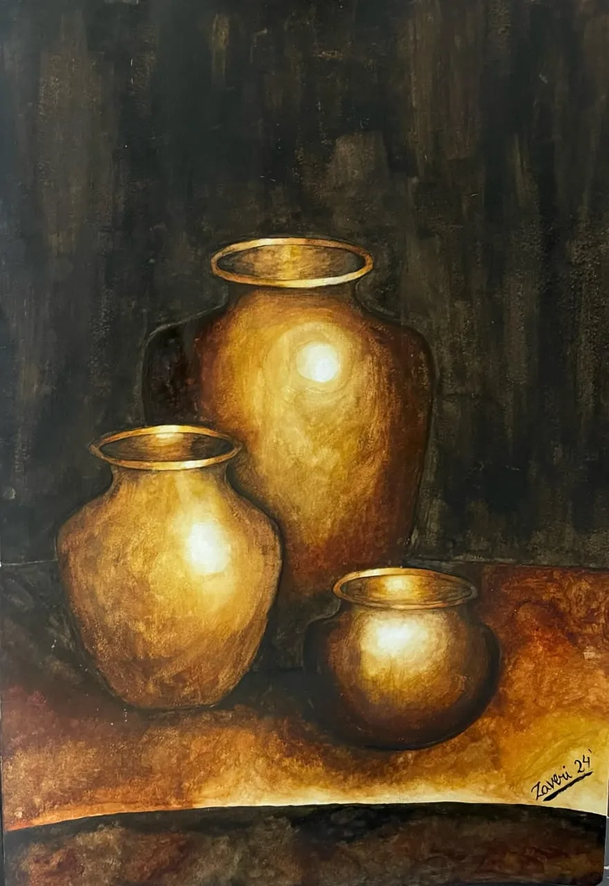 Grade XI Humanities student Zaveri Tahsin demonstrates her exceptional talent for realism in this striking painting of three copper pots. Her precise command of light and shadow enhances the natural metallic sheen of the vessels, adding remarkable depth and dimension. The warm, earthy tones of the copper stand out against the rich, textured background, guiding the viewer’s gaze to the intricate highlights and reflections. Zaveri’s meticulous brushwork and keen attention to detail elevate ordinary household objects into a compelling and visually enchanting composition.