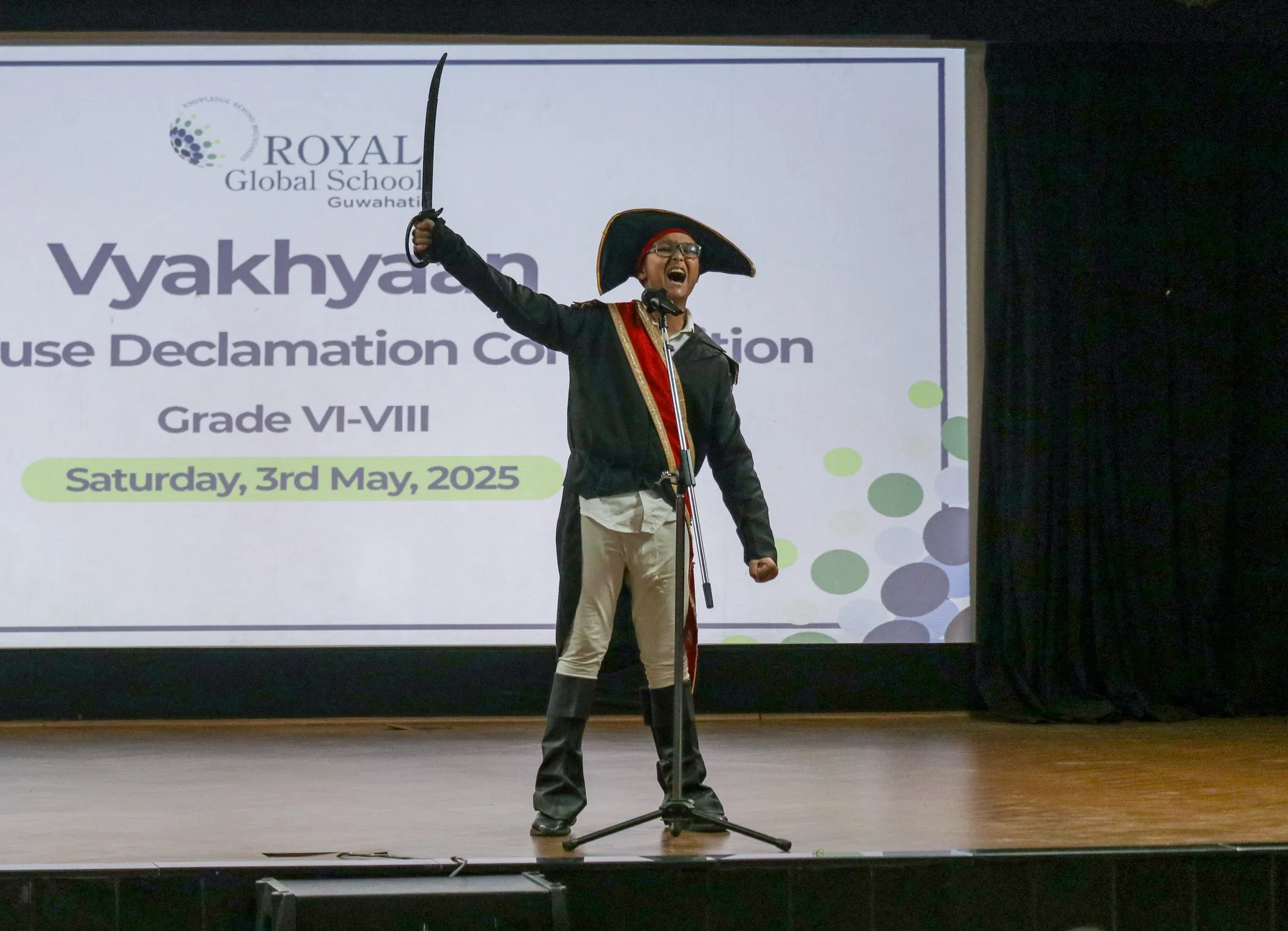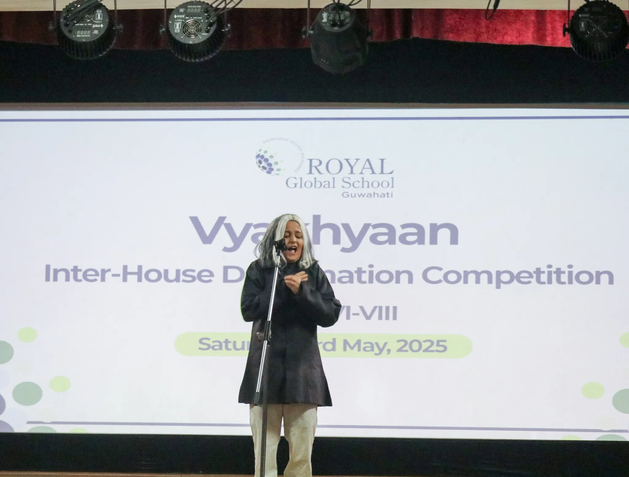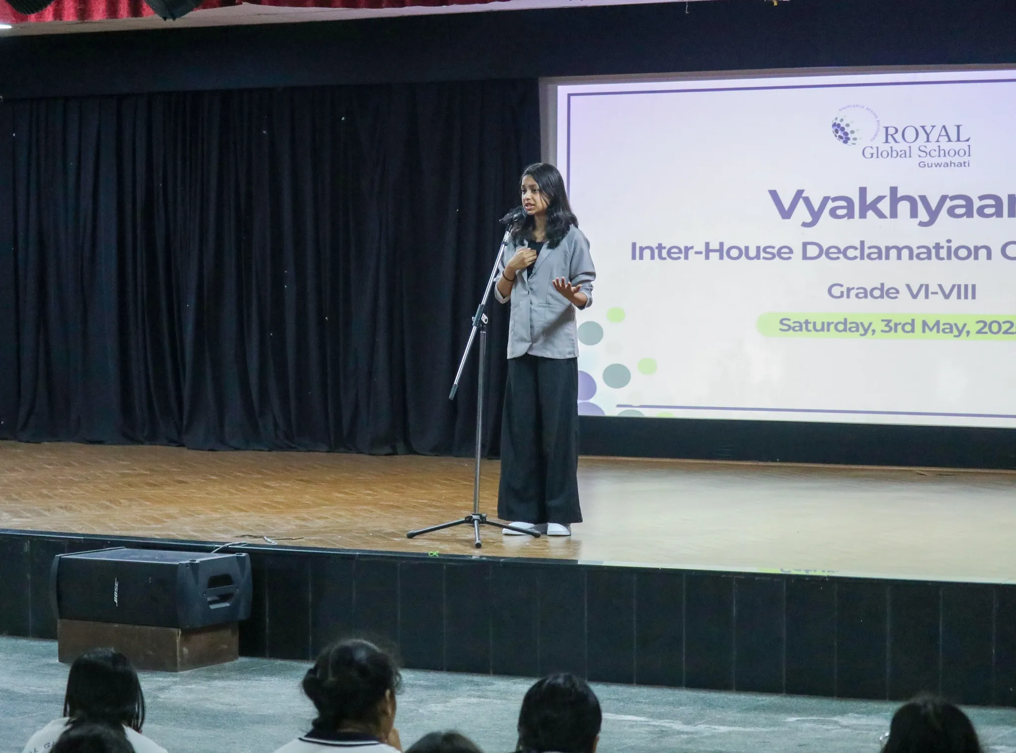 Vyakhyaan, the Inter-House Declamation Competition, was held at the Royal Colosseum of Royal Global School, with participants from all four houses—Gandhi, Mother Teresa, Tagore, and Vivekananda.