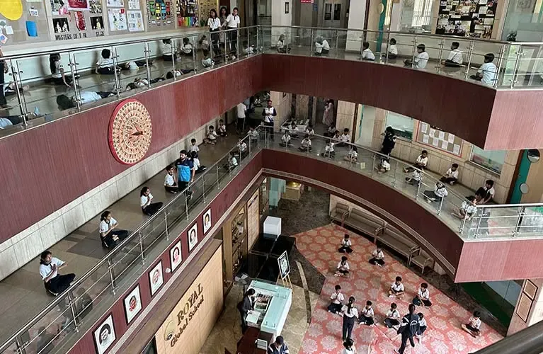 Our Royal Global School logo symbolizes the 360 degrees development of students with active and creative minds, a sense of understanding and compassion for others, and the courage to act on their beliefs globally- thus the Globe. The emerging bubbles on the Global stresses on the growth and total development of each child: spiritual, moral, intellectual, social, emotional, and physical.