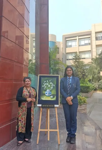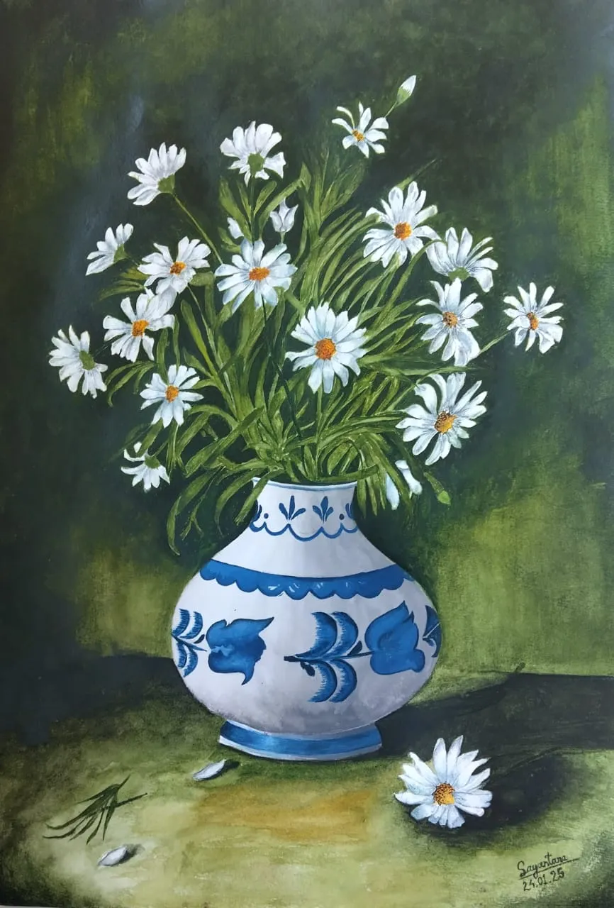 Sayantana Saikia, a Grade XI Humanities student, presents an enchanting composition featuring delicately blooming white flowers with long, vibrant green leaves. These elements are elegantly arranged in a captivating white pot adorned with graceful blue designs, which serves as the central focus of the artwork. Her skillful contouring and shading on the pot add depth and dimension, enhancing its realism. Set against a mysterious, muted green background, the painting evokes a sense of calm while hinting at whispered secrets. The masterful interplay of colors draws the viewer’s attention, fostering a profound connection with Mother Nature.
